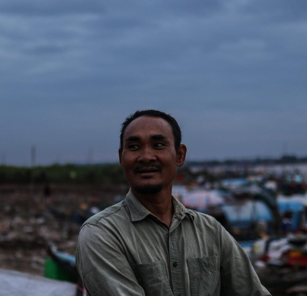 On the other side of Phnom Penh’s Northern Bridge, you will find an even quieter place. You only cross a bridge but already feel like you are somewhere else. If you head to its tip, you discover small fishing villages. It is still dark but you can already hear the morning prayers. Everyone wakes up in their own way. Behind a small fence, there are numerous boats, blue or green, most of which serve as homes for their owners. You can feel the air carrying the smell of the river.